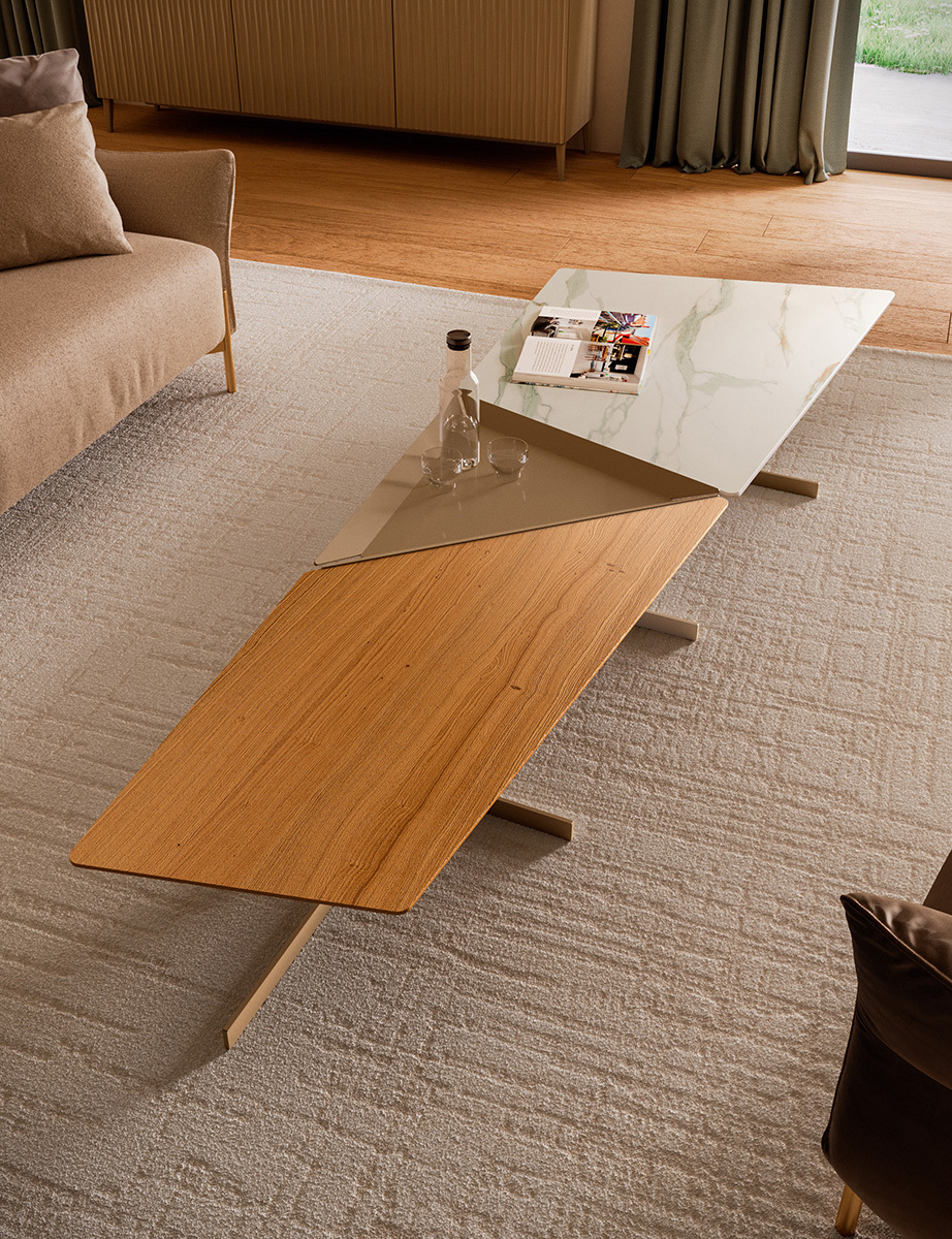 Il tavolino Bento non è un semplice complemento d’arredo, ma un vero e proprio sistema modulare firmato Bontempi Casa. Concepito come una trilogia di elementi dalle forme trapezoidali, Bento può essere utilizzato singolarmente oppure combinato in più unità per creare composizioni armoniose e personalizzate.