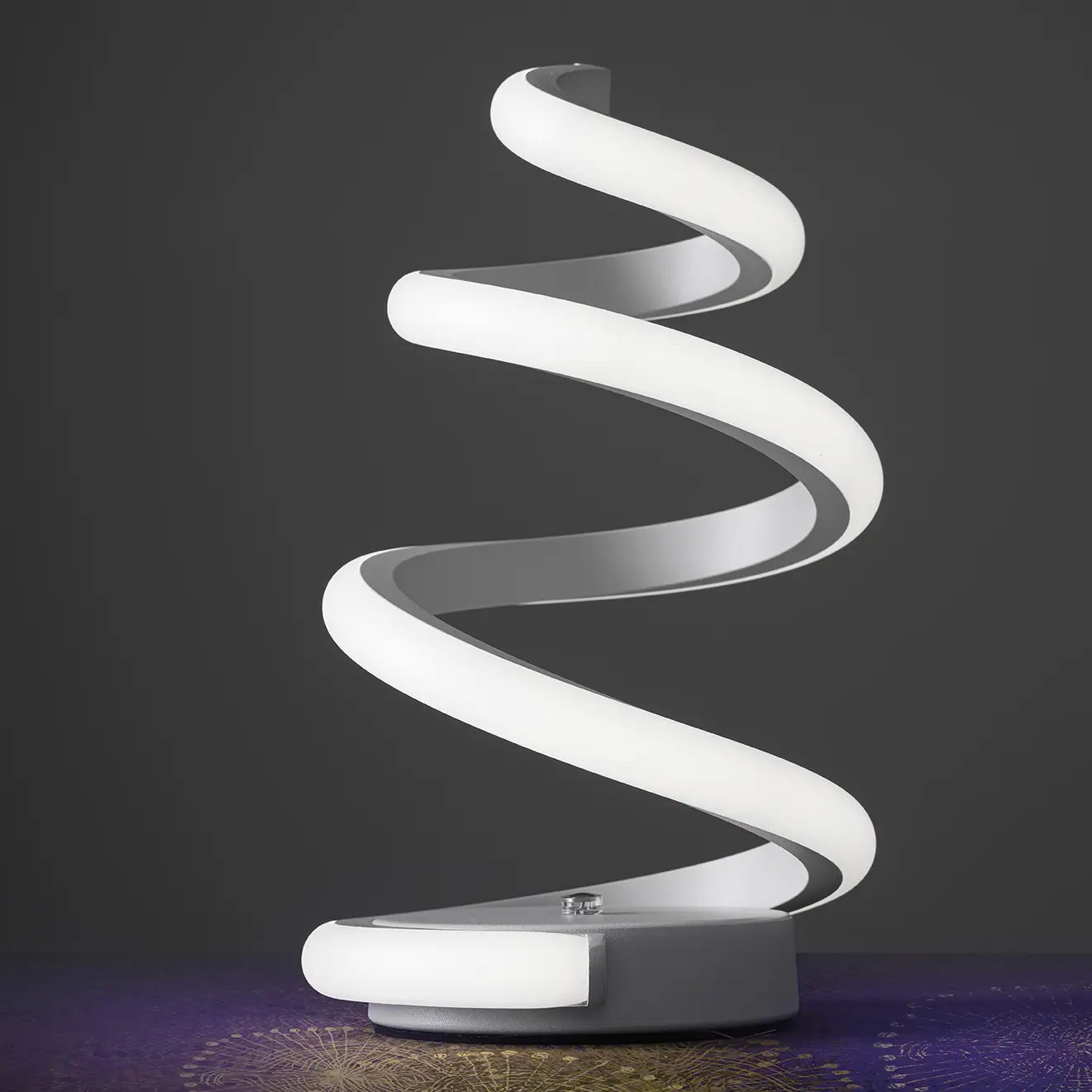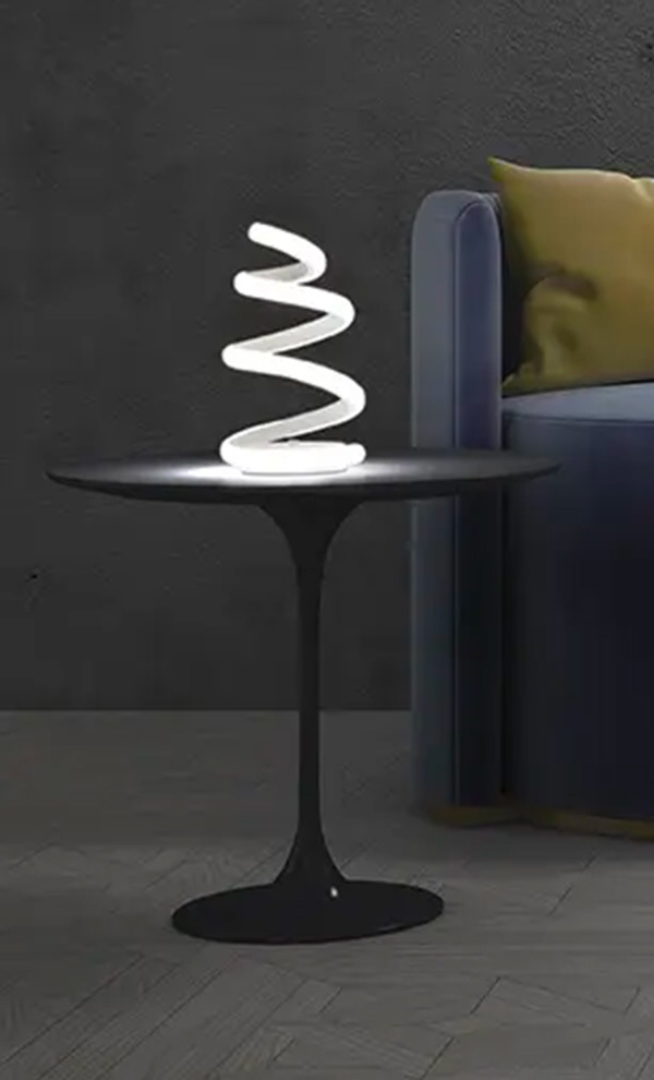 Experience the elegant luminous presence of the Promoingross BOUCLE T1 table lamp, a compact version designed for desks, shelves, or bedside tables. Featuring the same sculptural spiral design as the floor lamp, this model combines functionality and style in a smaller footprint. The slim metal frame supports the smooth spiral LED diffuser made of opaline white silicone, distributing soft, uniform warm light.