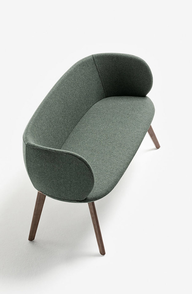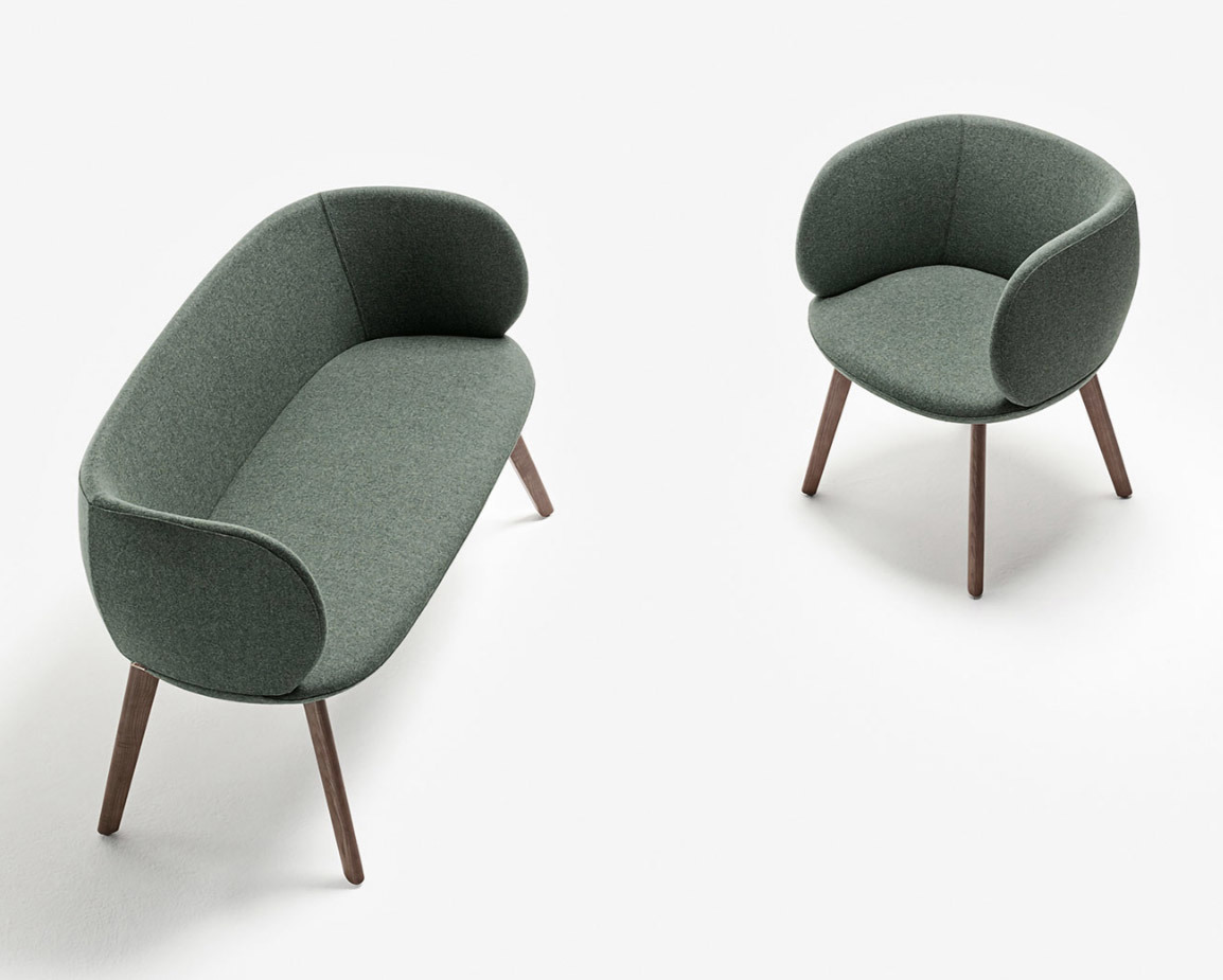 Forma accogliente e generosa: la collezione contempla poltrone, lounge e divani a 2 posti con schienale e braccioli sagomati in stile arrotondato.