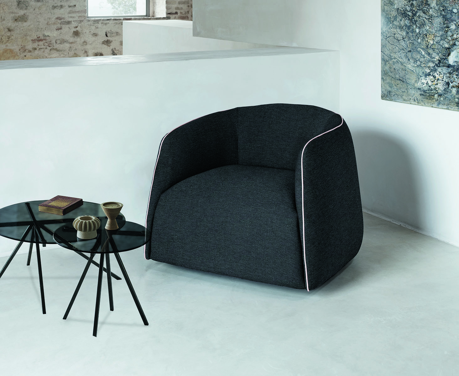 Disponibile in versione fissa o girevole, la poltrona Kodi si adatta a qualsiasi ambiente contemporaneo, dal soggiorno alla zona lettura o alla suite di un hotel.