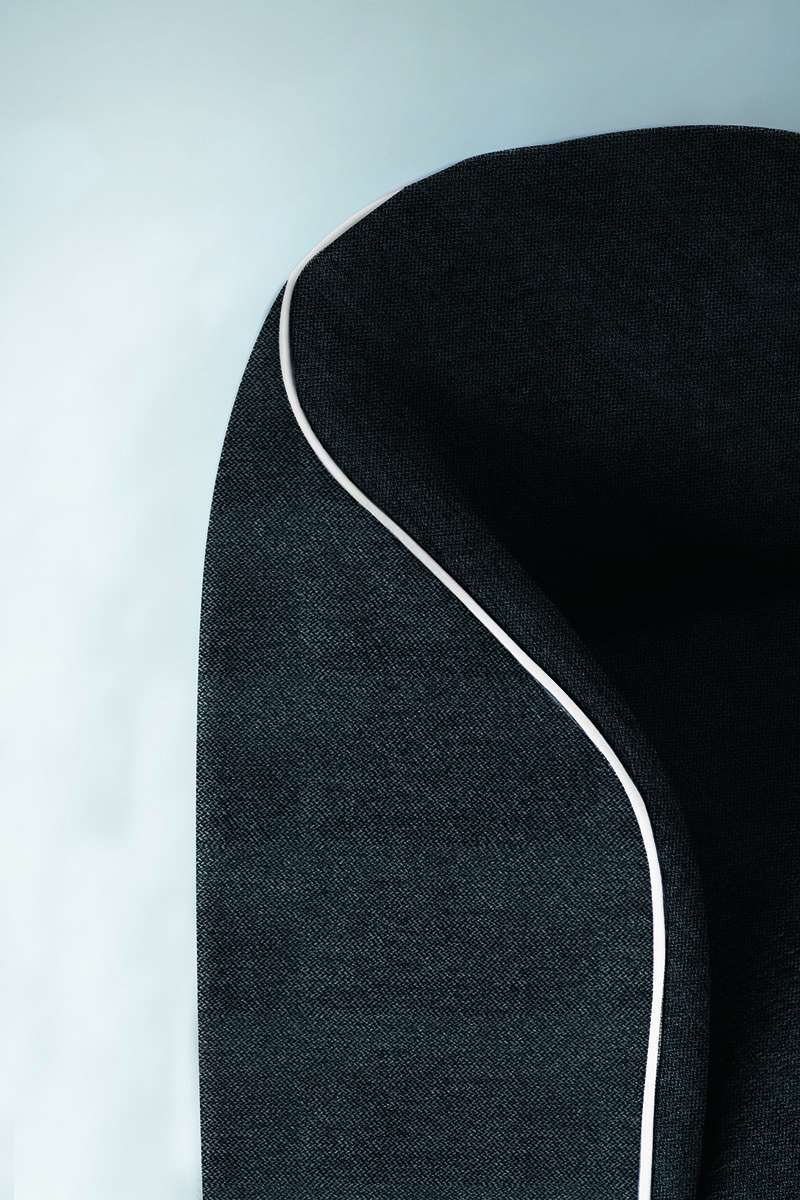 Il rivestimento personalizzabile in tessuto o pelle permette di creare combinazioni cromatiche su misura. Le cuciture a vista e il piping decorativo mettono in risalto le linee sinuose e ne esaltano il design Made in Italy.