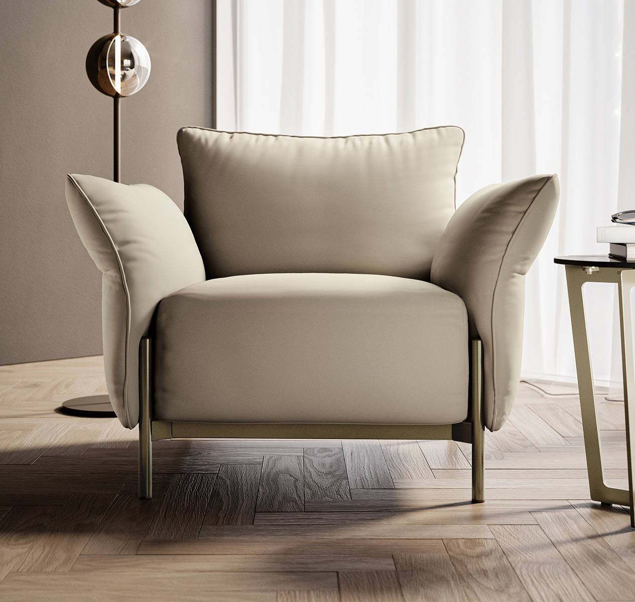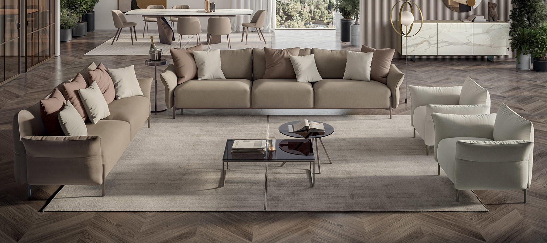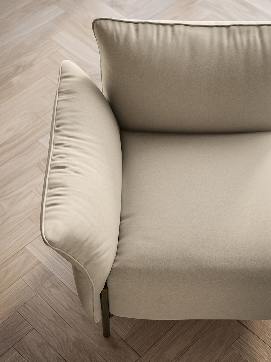 Silhouette grafica dal profilo netto, dove le linee pulite dialogano con leggere curvature che ricordano “ali” sui braccioli. Il risultato è un’estetica di leggerezza e armonia visiva