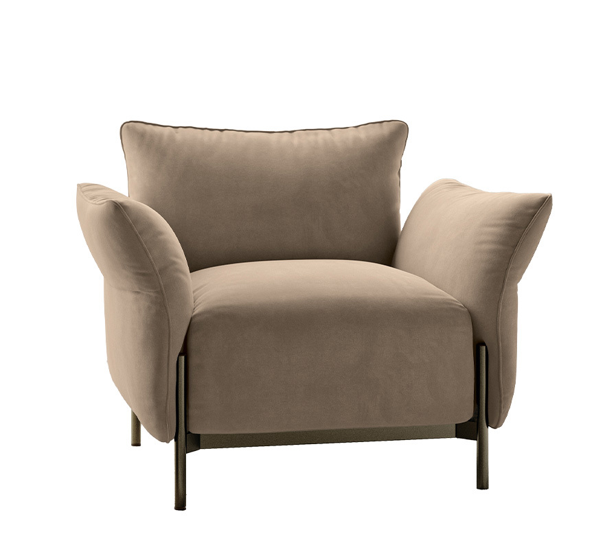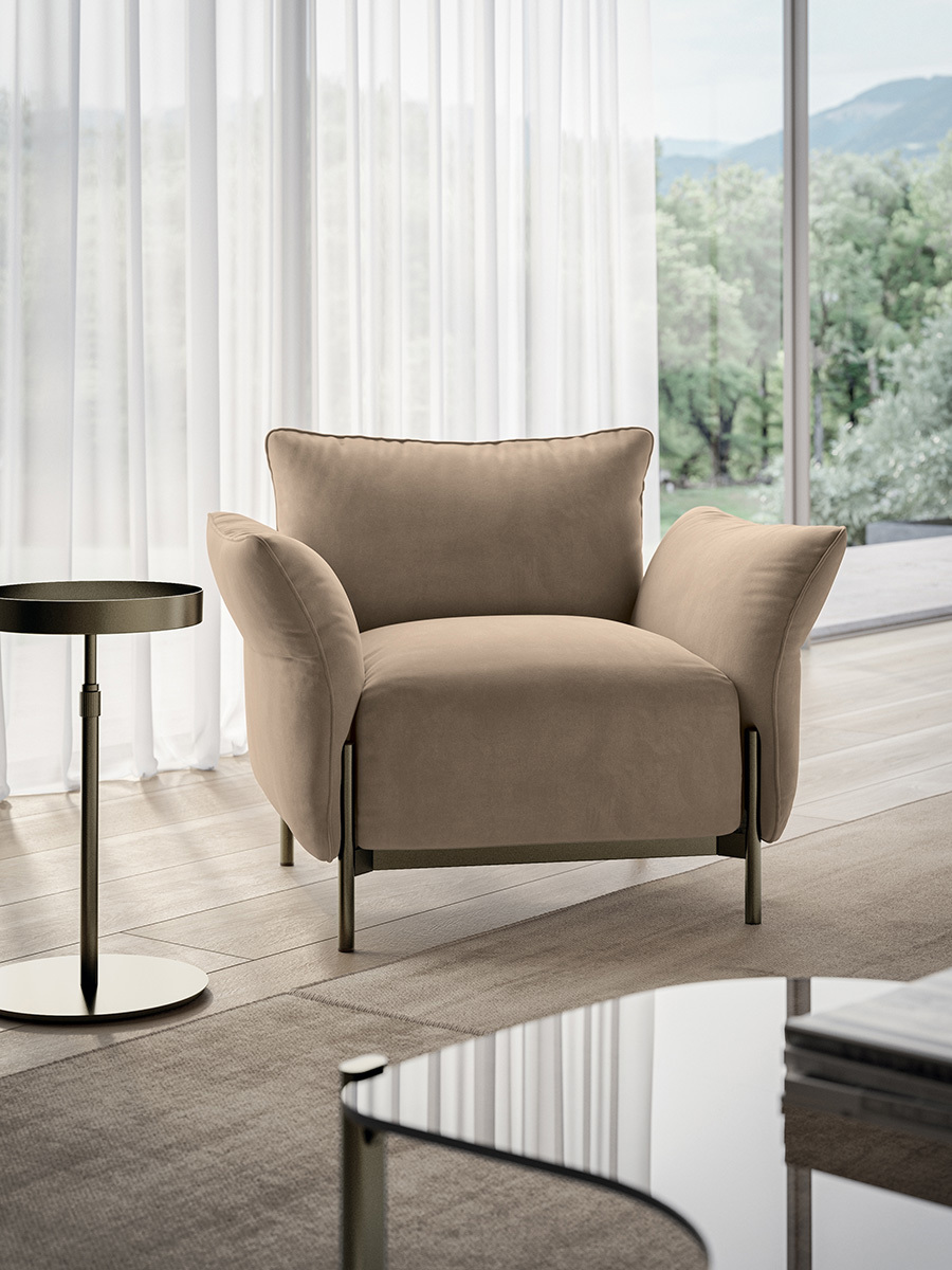 Telaio interno in legno e pannelli, con braccioli delicati e sostegno elegante. Le gambe sono in metallo laccato, disponibili in varie finiture per integrarsi con il resto dell’arredo.