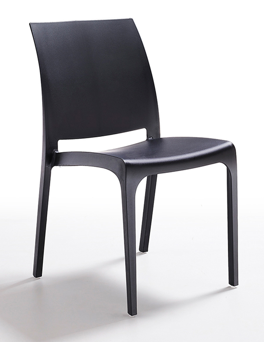 La struttura leggera e impilabile permette di ottimizzare gli spazi, mentre le linee ergonomiche assicurano una seduta comoda e stabile.