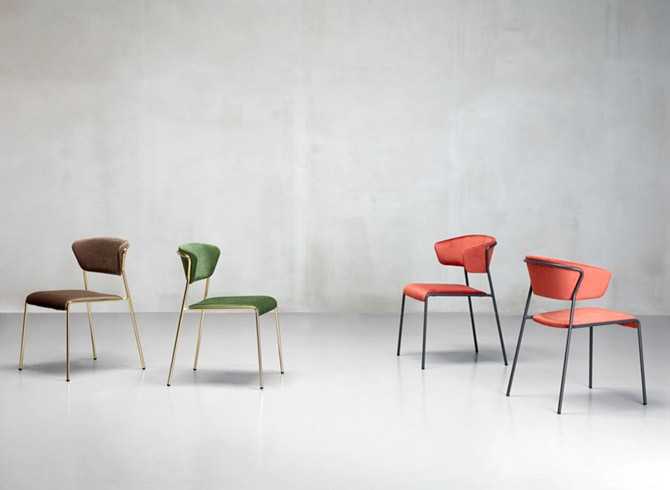 poltrona con struttura in acciaio verniciato, e seduta avvolgente rivestita in tessuto