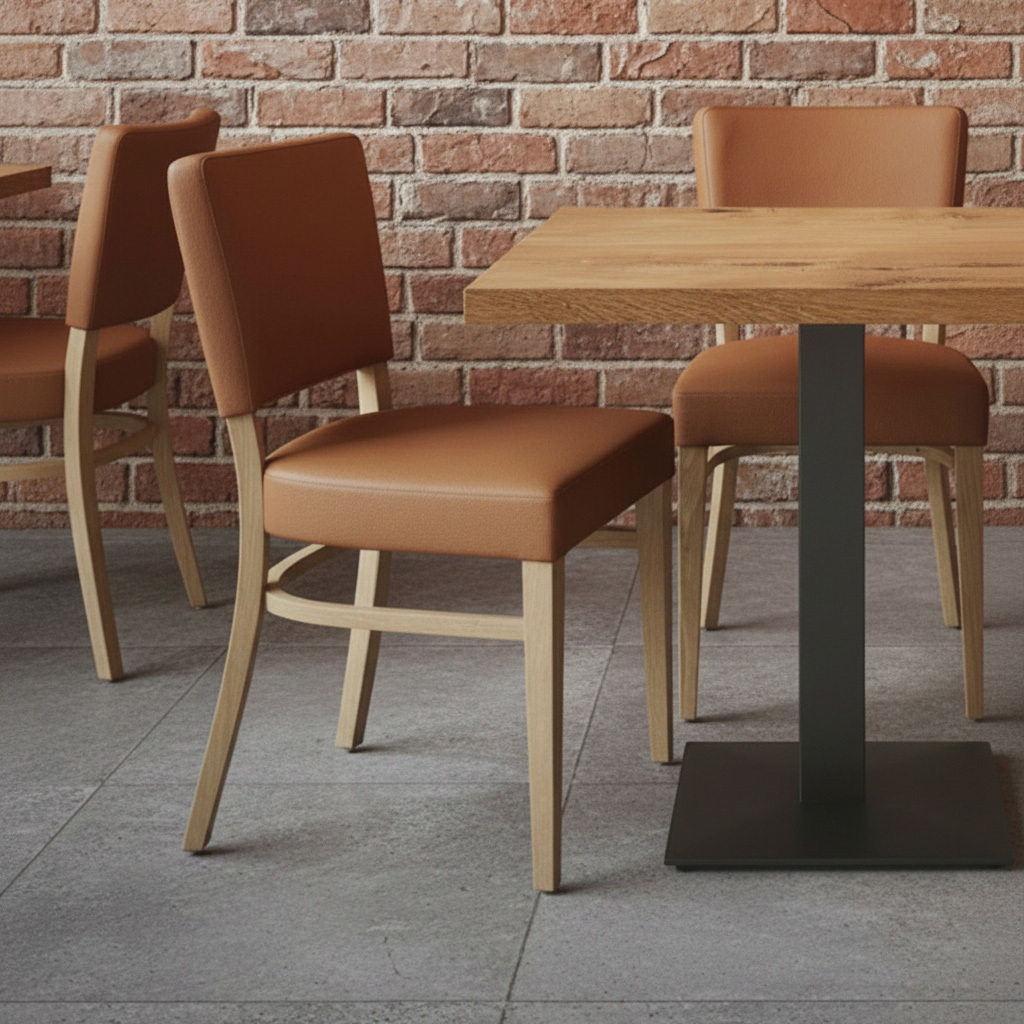 La sedia è realizzata in legno di faggio massello, disponibile in diverse finiture di colore, che garantiscono resistenza e durata nel tempo. Il sedile e lo schienale imbottiti e rivestiti offrono massimo comfort anche nelle sedute prolungate, unendo praticità e stile in un unico prodotto.