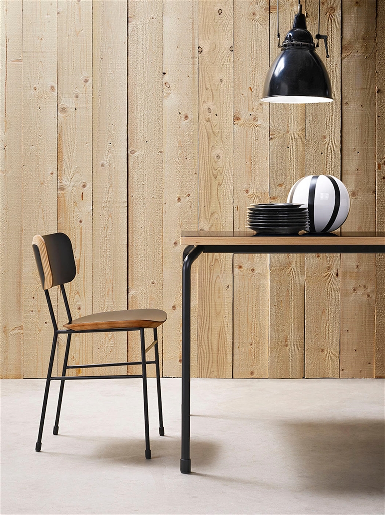Sedia comoda, versatile e allo stesso tempo elegante. La struttura è in acciaio verniciato e la seduta e lo schienale sono in legno curvato impiallaciato in diverse essenze.