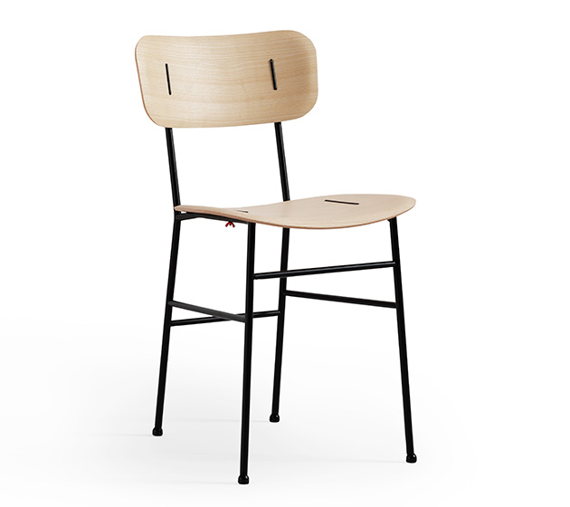Sedile e schienale imbottiti o in legno con inserti metallici a vista in tinta con la struttura
