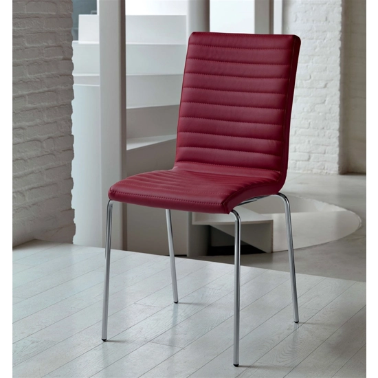 La struttura è disponibile in acciaio cromato o verniciato in 25 colori, mentre la seduta, con trapuntatura orizzontale, è rivestita in ecopelle morbida, vera pelle o tessuti antimacchia di alta qualità, offrendo massima personalizzazione.