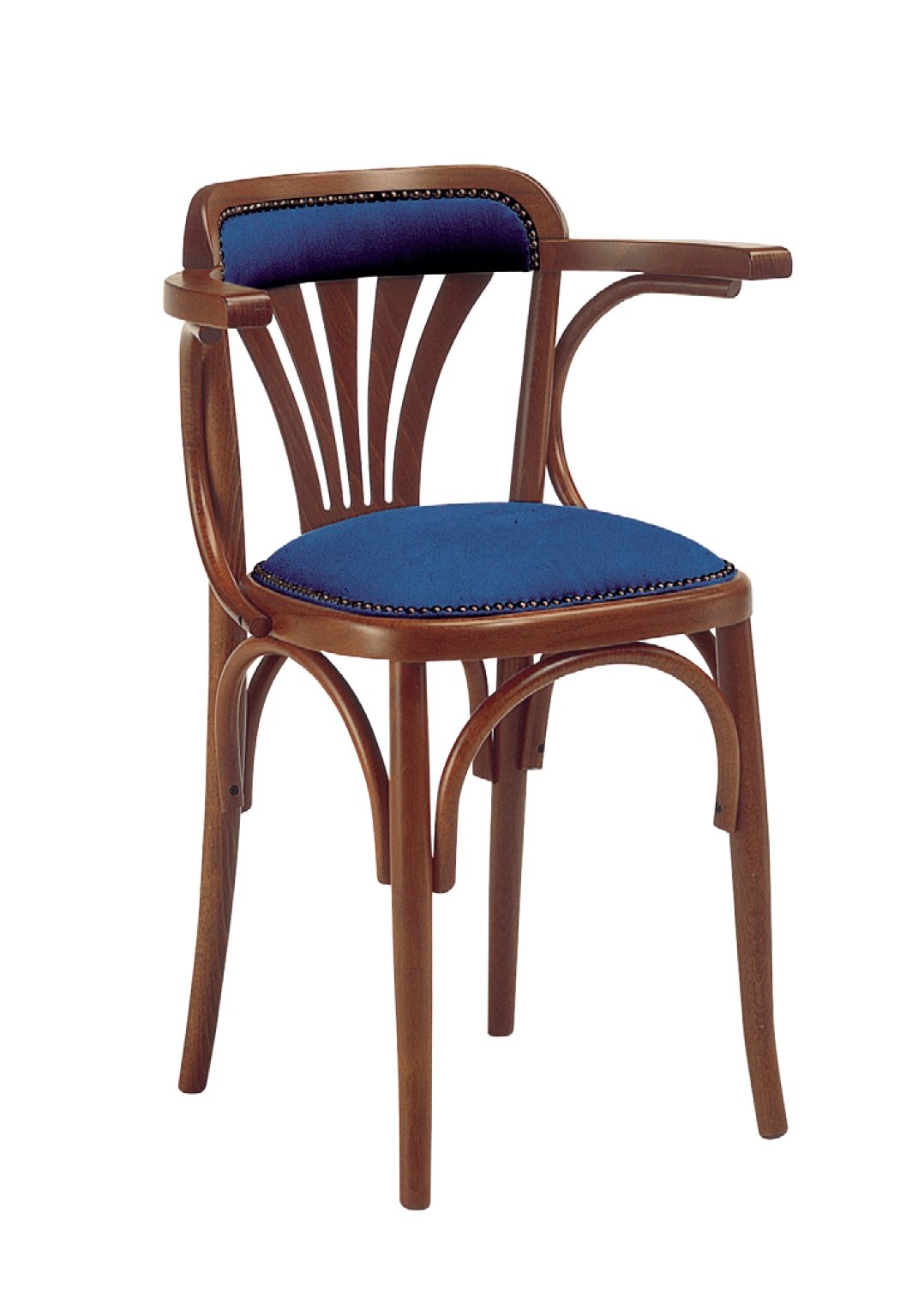 Sedia in legno di faggio curvato in vari colori, con seduta imbottita o rivestita in tessuto.
