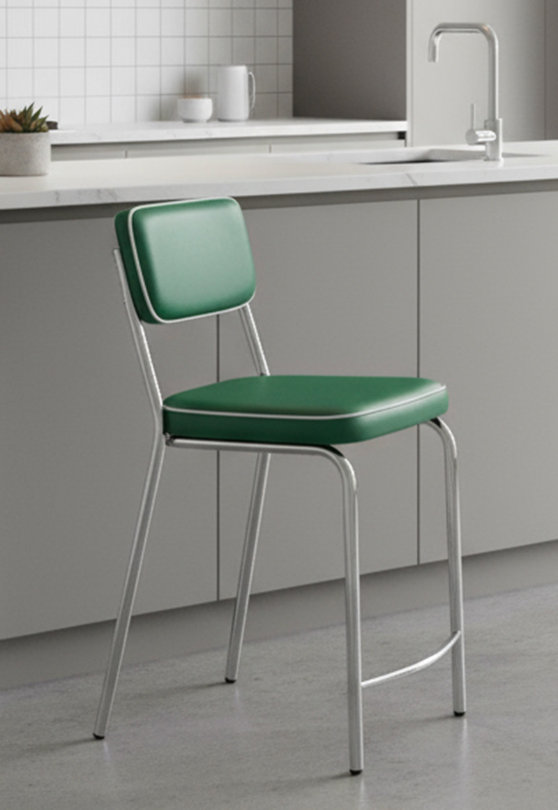E' lo sgabello americano degli anni '50 rivestito in ecopelle di vari colori, con bordini in contrasto bianco o nero.