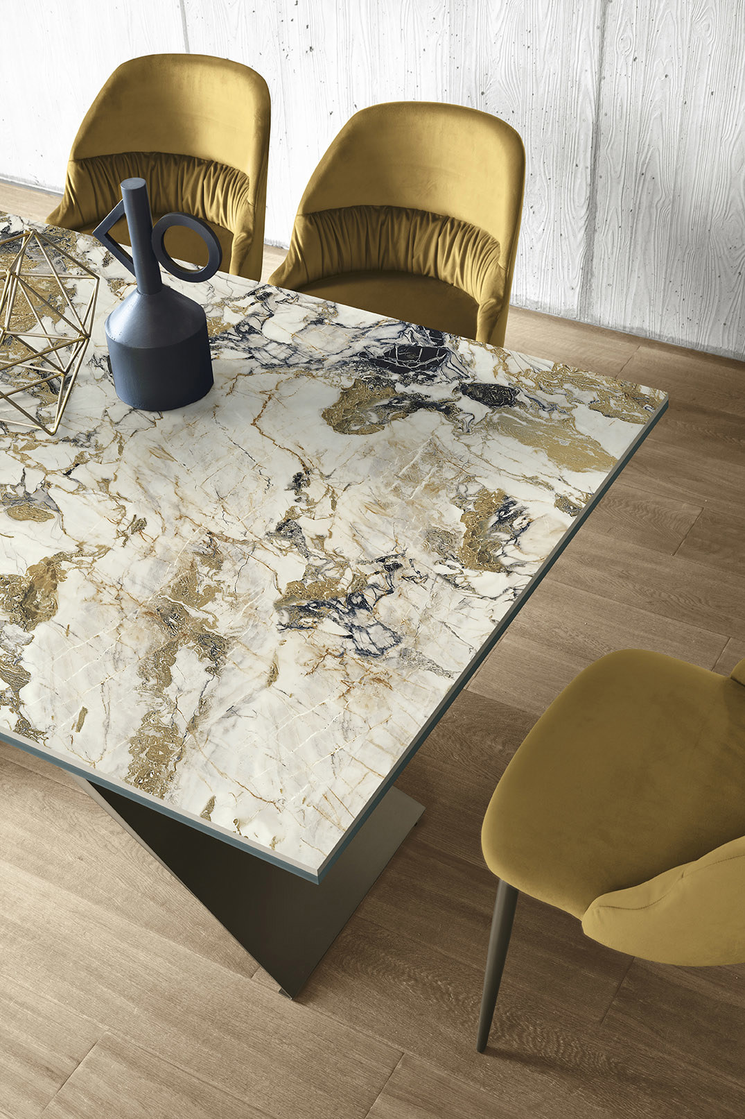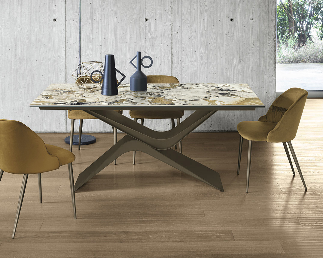 La sua base in metallo architetturale aggiunge carattere ed eleganza alla zona pranzo dalle linee decise e contemporanee, unita a un piano elegante, regala un impatto visivo forte, pur mantenendo praticità e comfort.