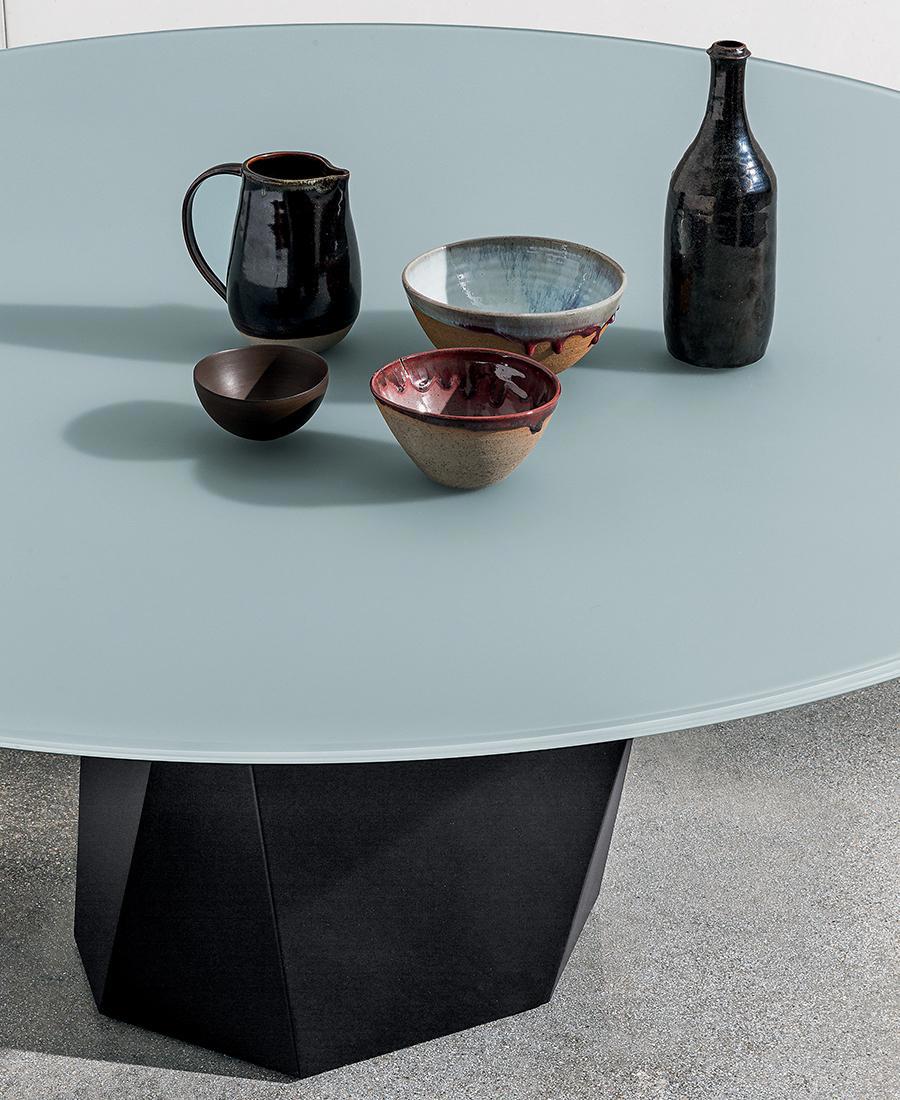 La struttura si distingue per la base in metallo verniciato, disponibile in diverse finiture, caratterizzata da volumi inclinati e linee decise che creano un effetto visivo solido ma al tempo stesso elegante. Il piano, completamente personalizzabile, è proposto in vetro temperato, ceramica o materiali effetto marmo, per adattarsi a diversi stili d’arredo.