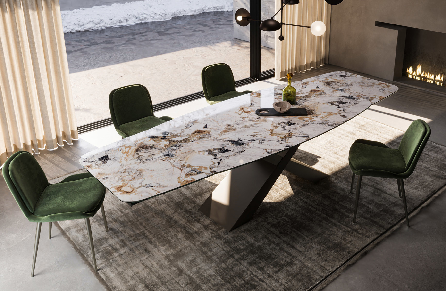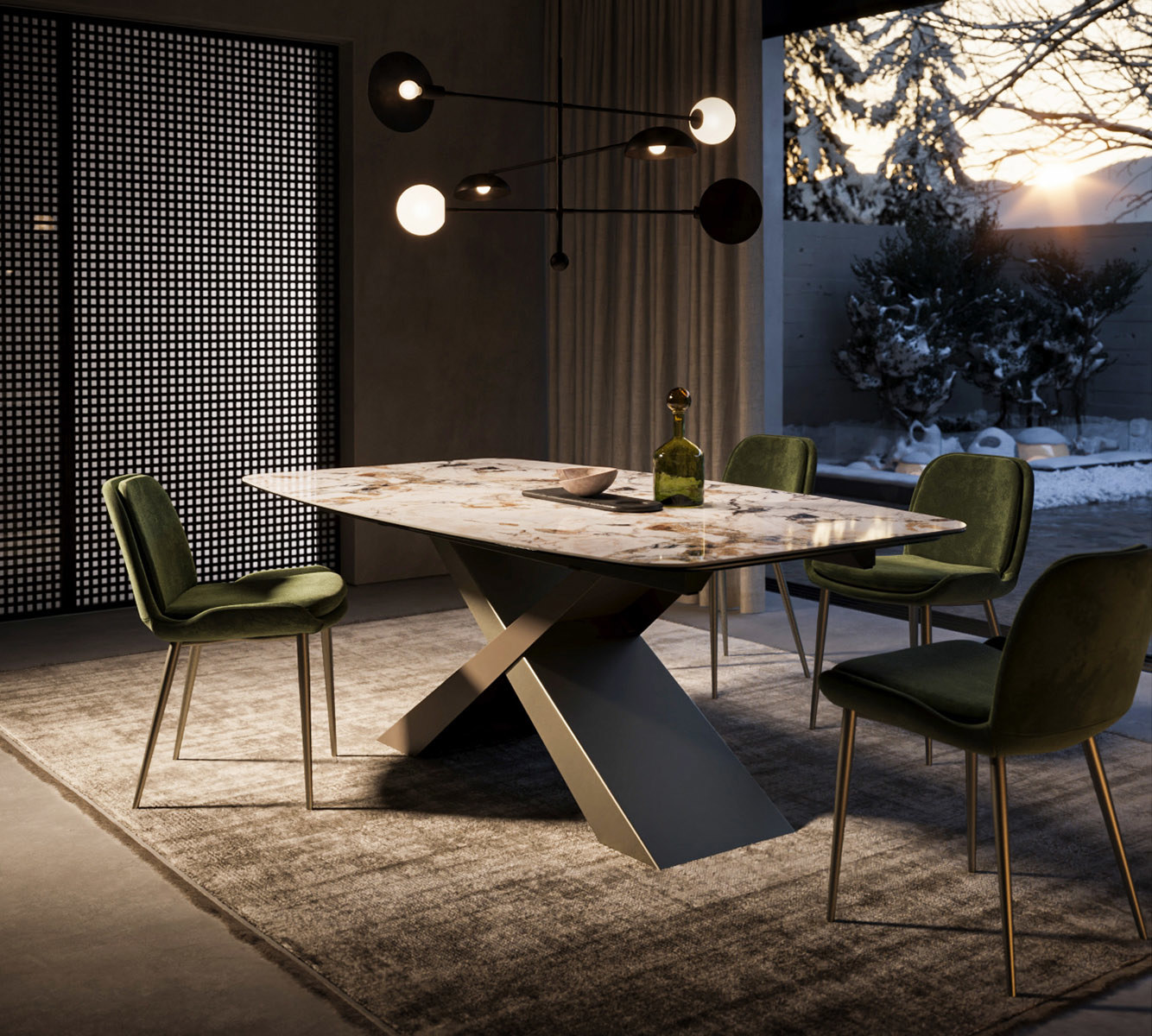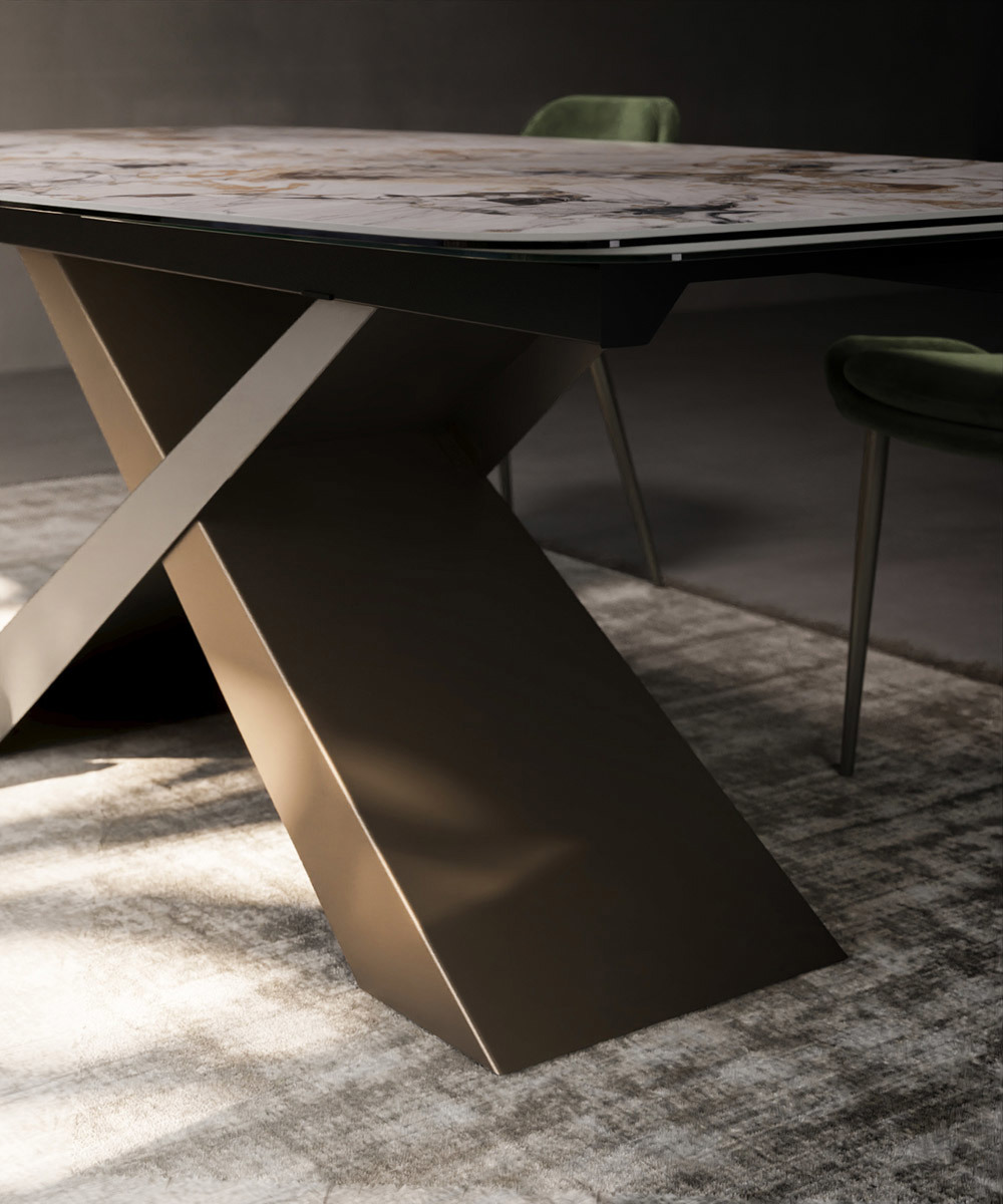 Realizzato con struttura metallica verniciata a polvere e dotato di piano in materiali pregiati (vetro, ceramica, materico), il modello è disponibile in versione allungabile oppure fissa, con molteplici configurazioni dimensioni e finiture.