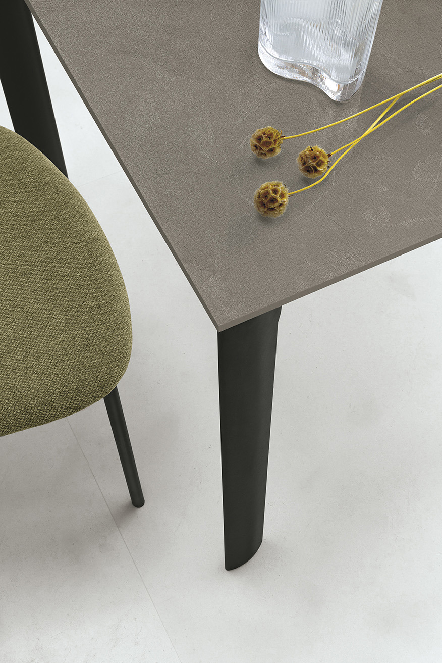 Il tavolo è disponibile con diversi piani e abbinabile a struttura in metallo verniciato, con finiture personalizzabili per armonizzarsi con qualsiasi stile d’arredo.