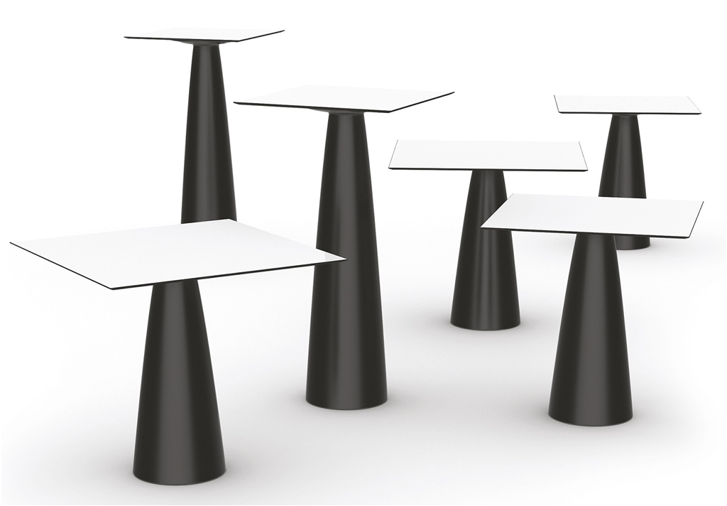 La collezione Hoplà comprende tavoli in due altezze e con piano quadrato o rotondo di diverso ingombro.