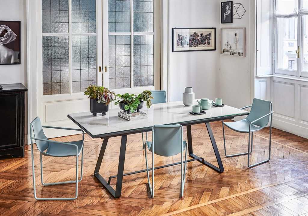 In questa versione il tavolo Alfred viene proposto con il piano allungabile in vetro o cristalceramica e struttura in acciaio verniciato in diversi colori