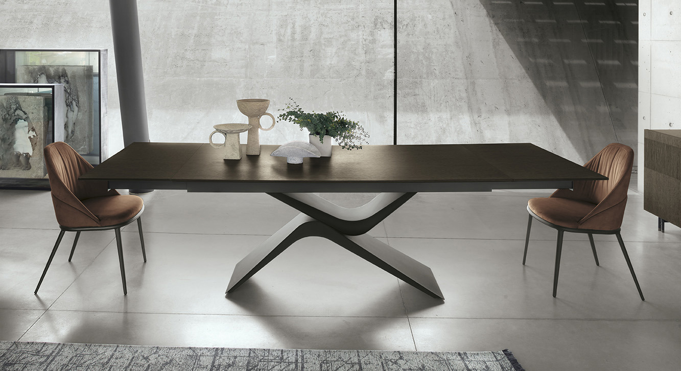 La sua base in metallo architetturale aggiunge carattere ed eleganza alla zona pranzo dalle linee decise e contemporanee, unita a un piano elegante, regala un impatto visivo forte, pur mantenendo praticità e comfort.