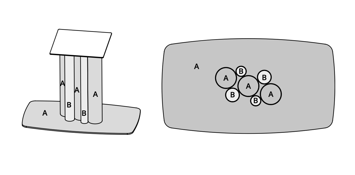 NB: il basamento può avere un unico colore oppure un mix di colori (visibile tra le varianti); la dase e i tubi più grandi saranno nella finitura dominante identificata con la lettera A, mentre quelli piccoli in finitura secondaria identificata con la letterea B