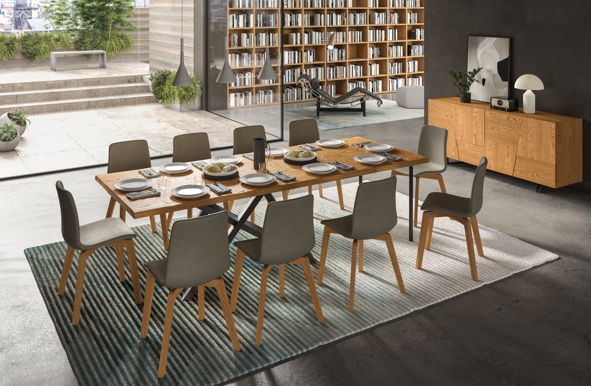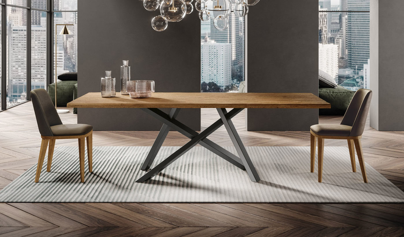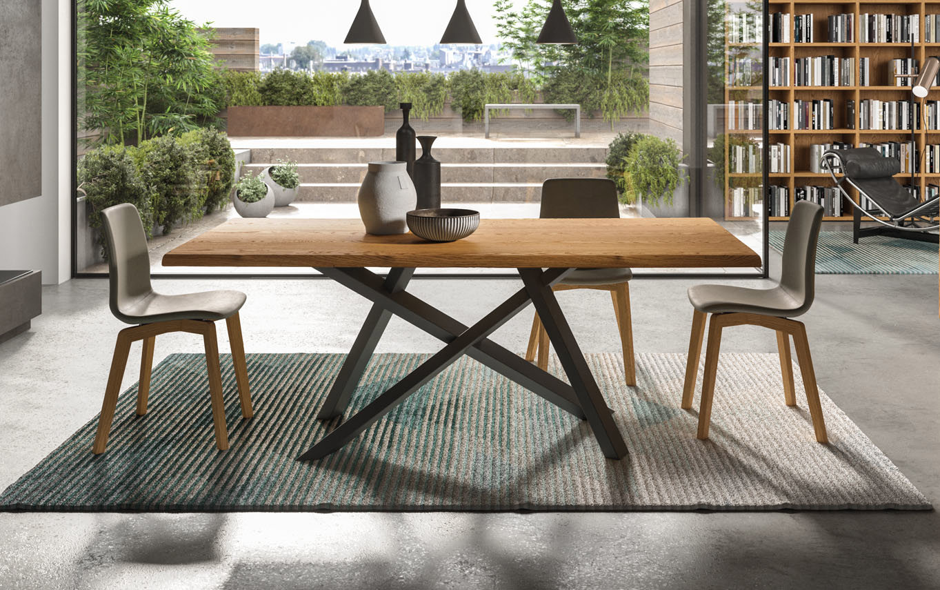 Serie di tavoli Crossing fissi in Rubberwood completamente massiccio lavorato dopo un accurato ciclo di essiccazione.