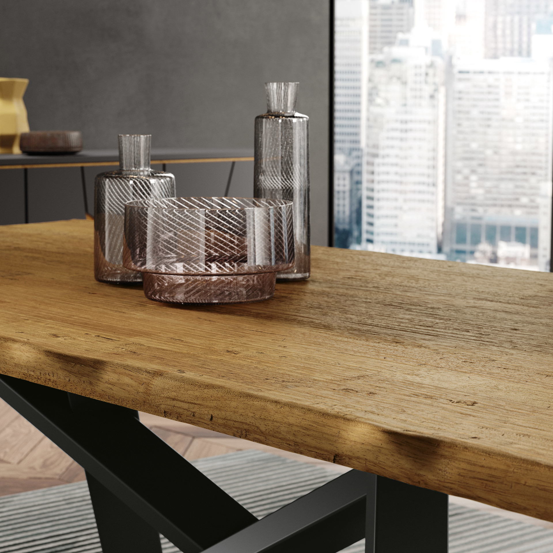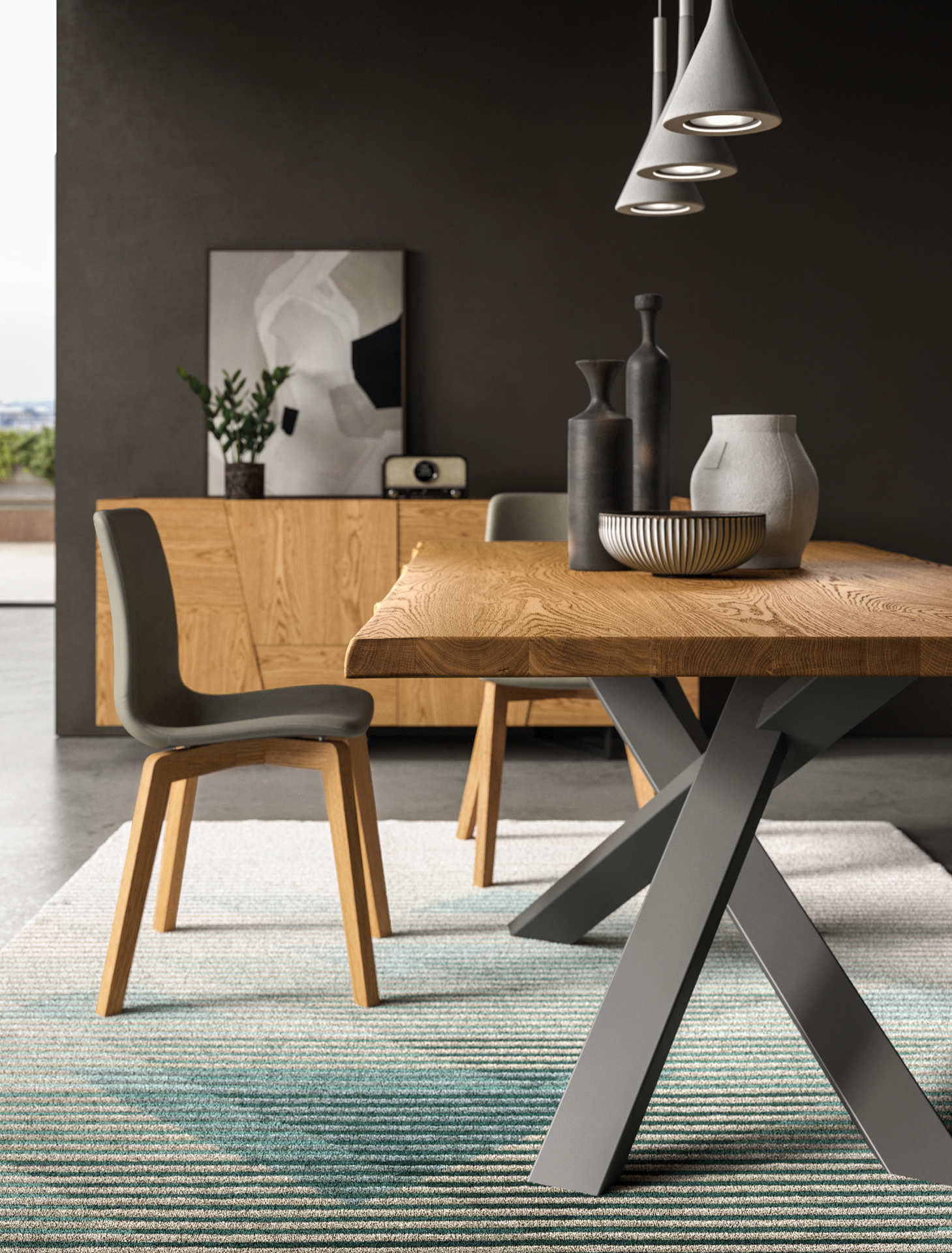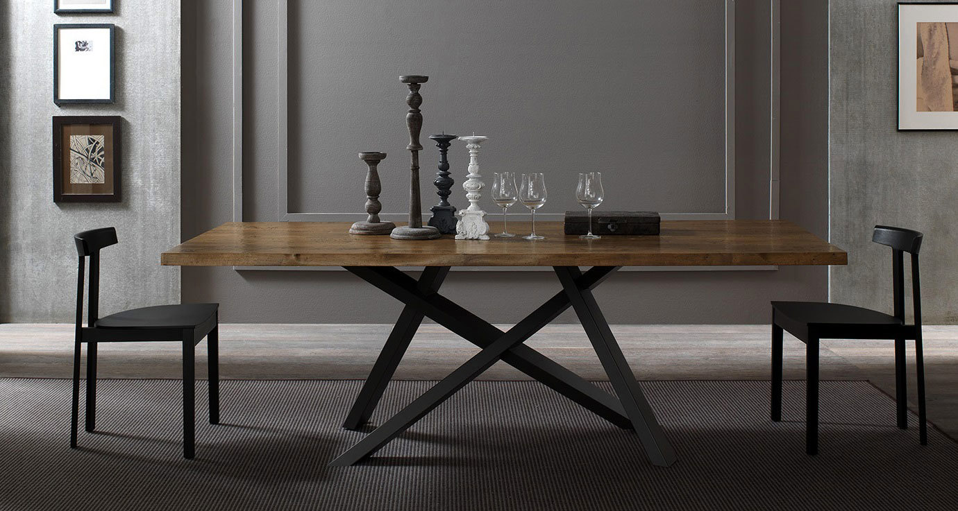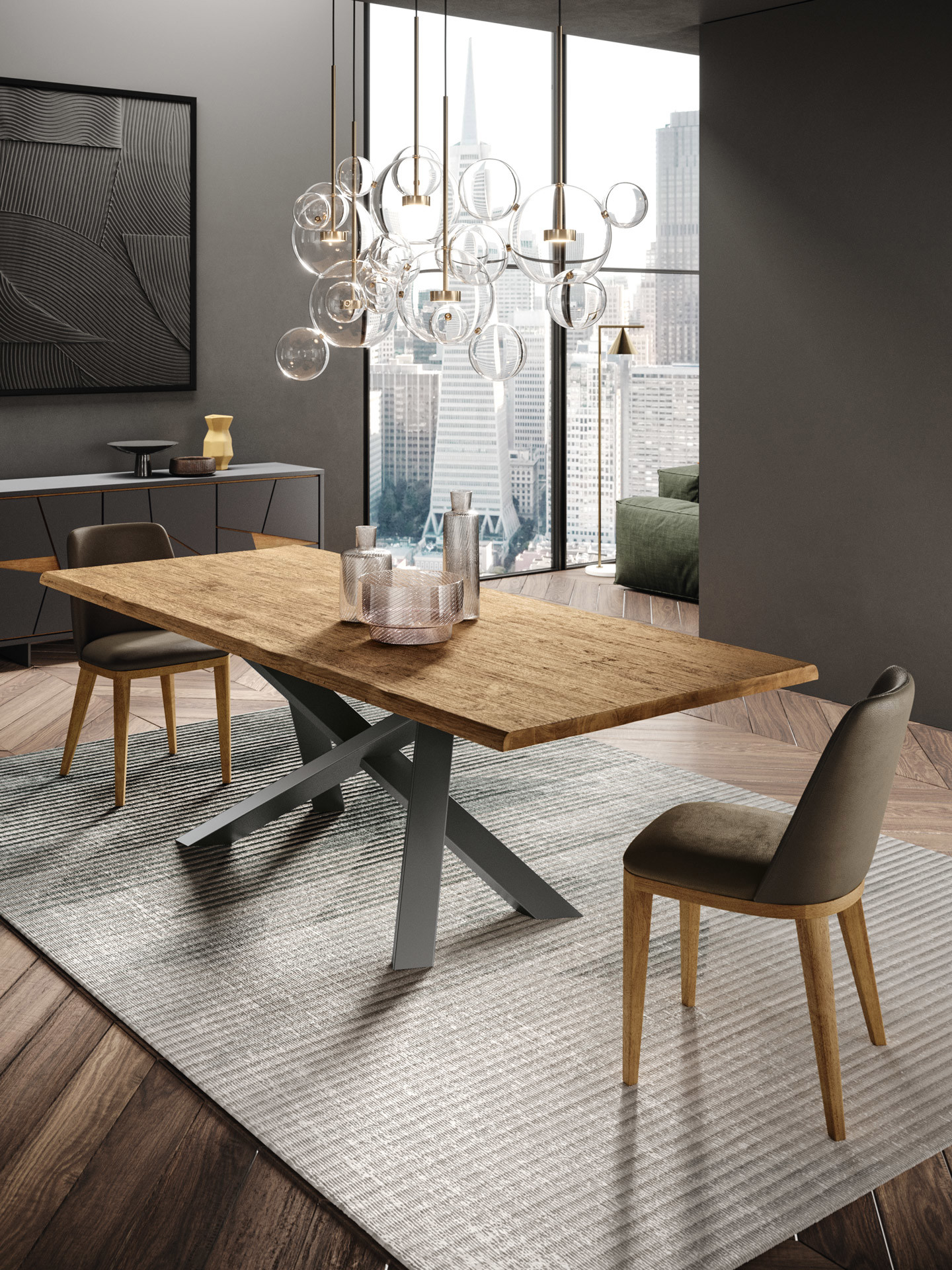 Serie di tavoli Crossing fissi in Rubberwood completamente massiccio lavorato dopo un accurato ciclo di essiccazione.