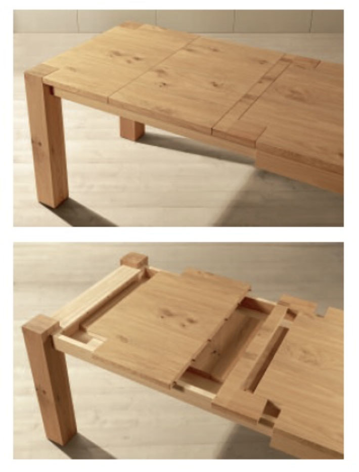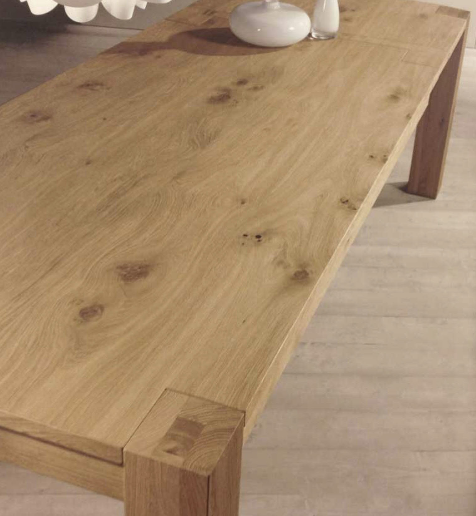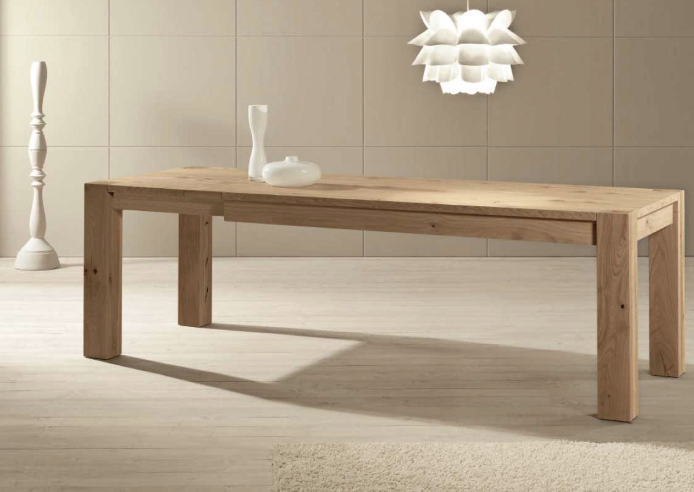 Serie tavoli Panama Rettangolari Allungabili con gamba in quercia (rovere) massellata o in taglio intero da 12 x 12 cm e piano quercia cuorata spessore 3 cm.