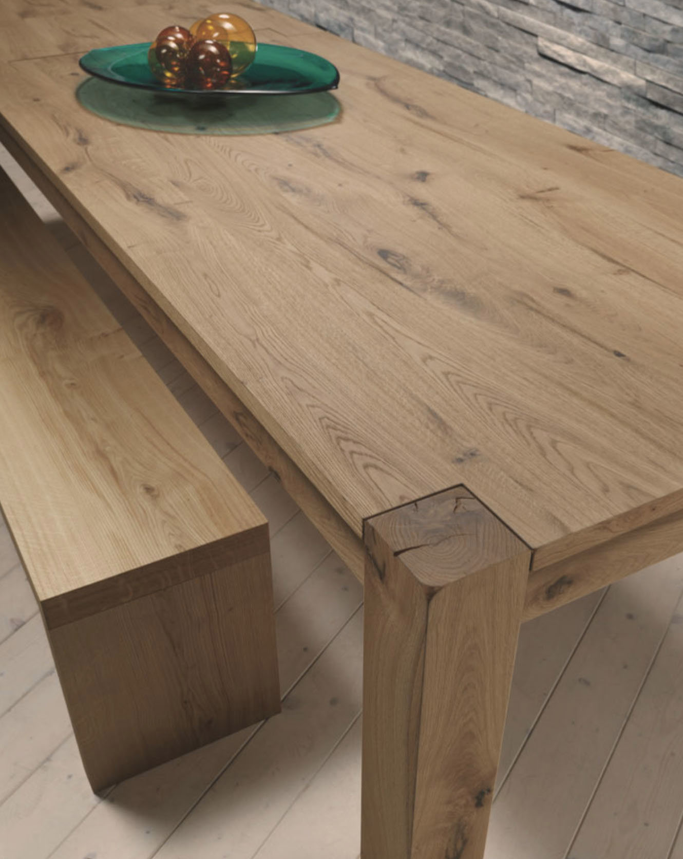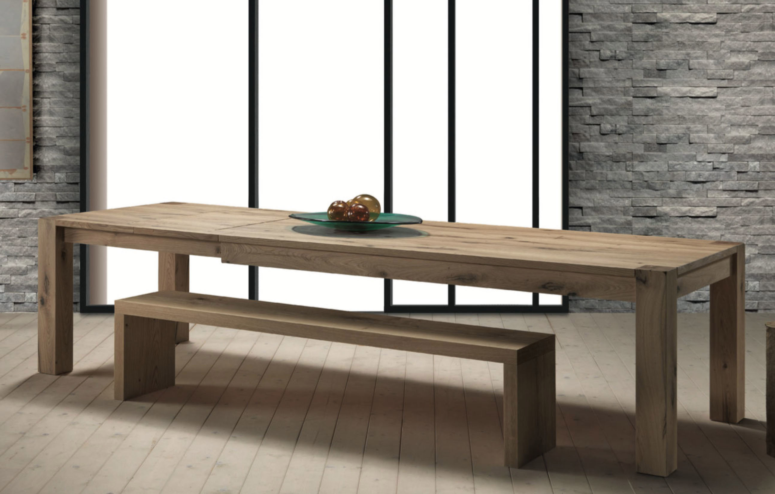 Il tavolo è allungabile con sistema telescopico a guide e cassonetto in legno con allunga estraibile.
