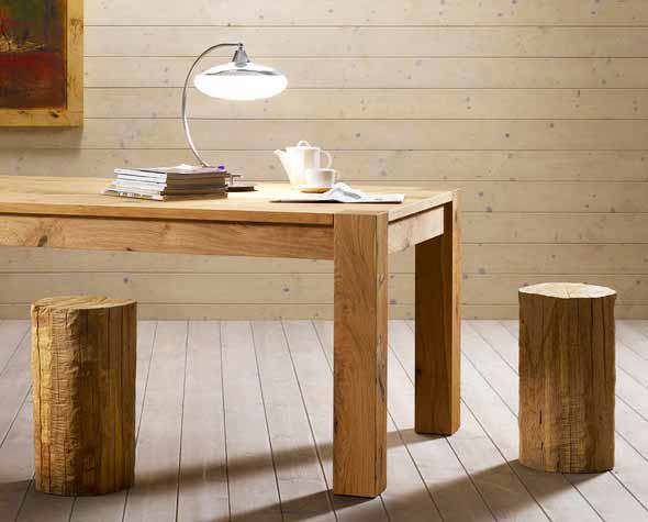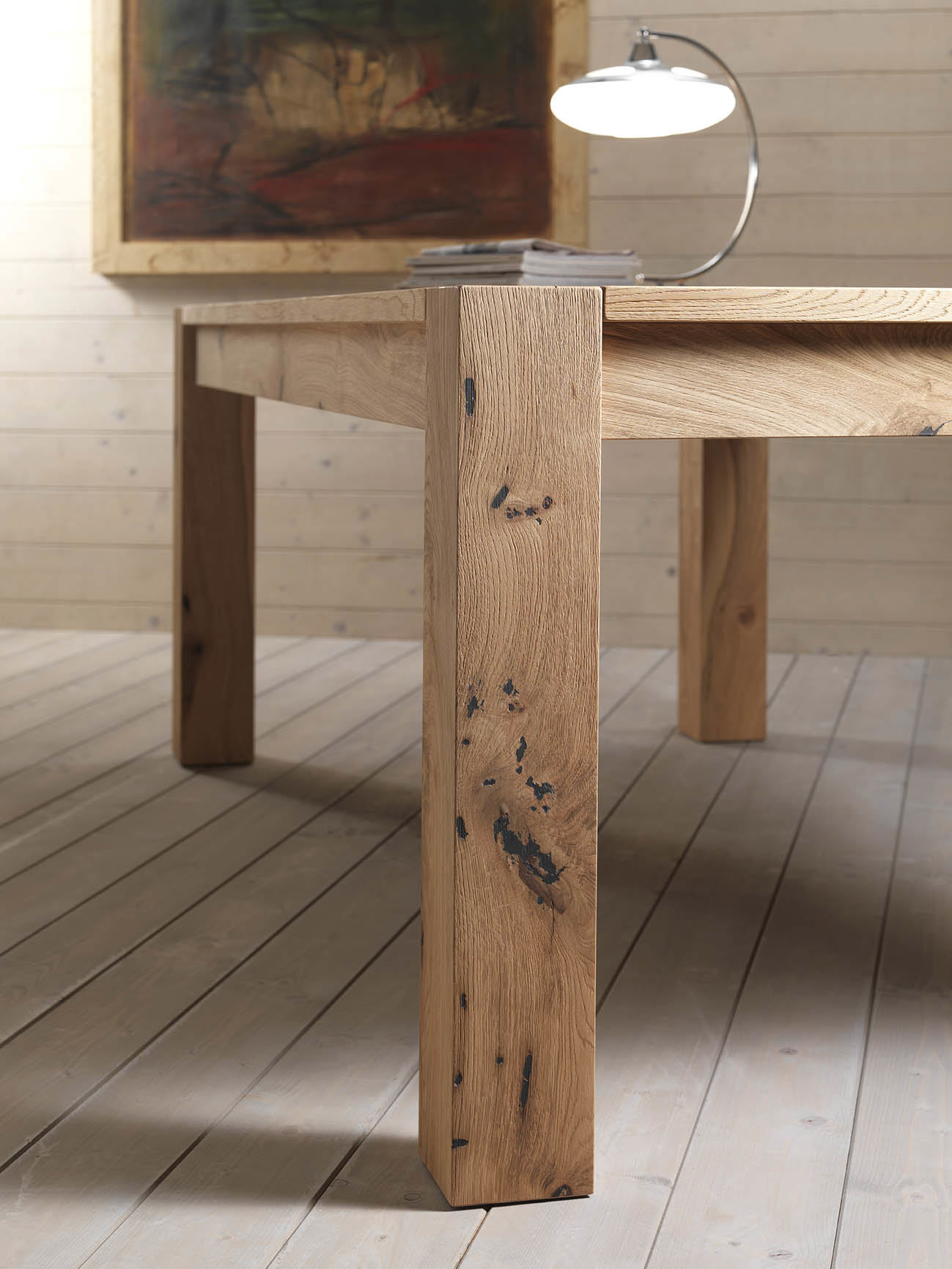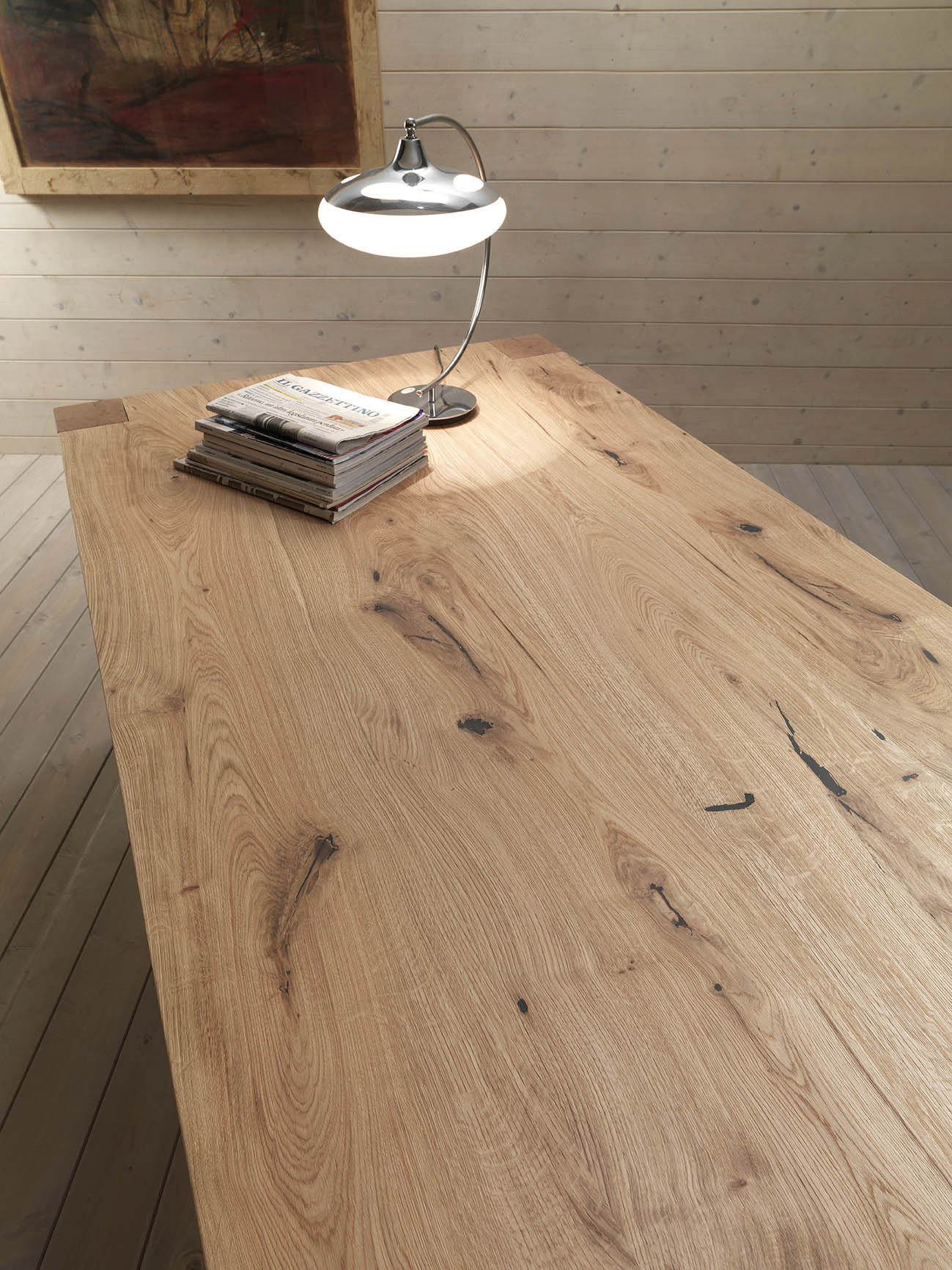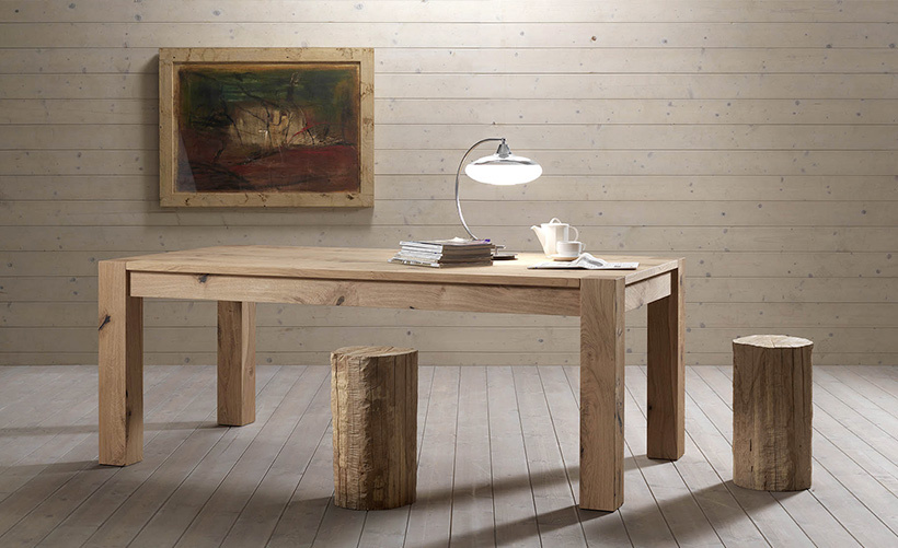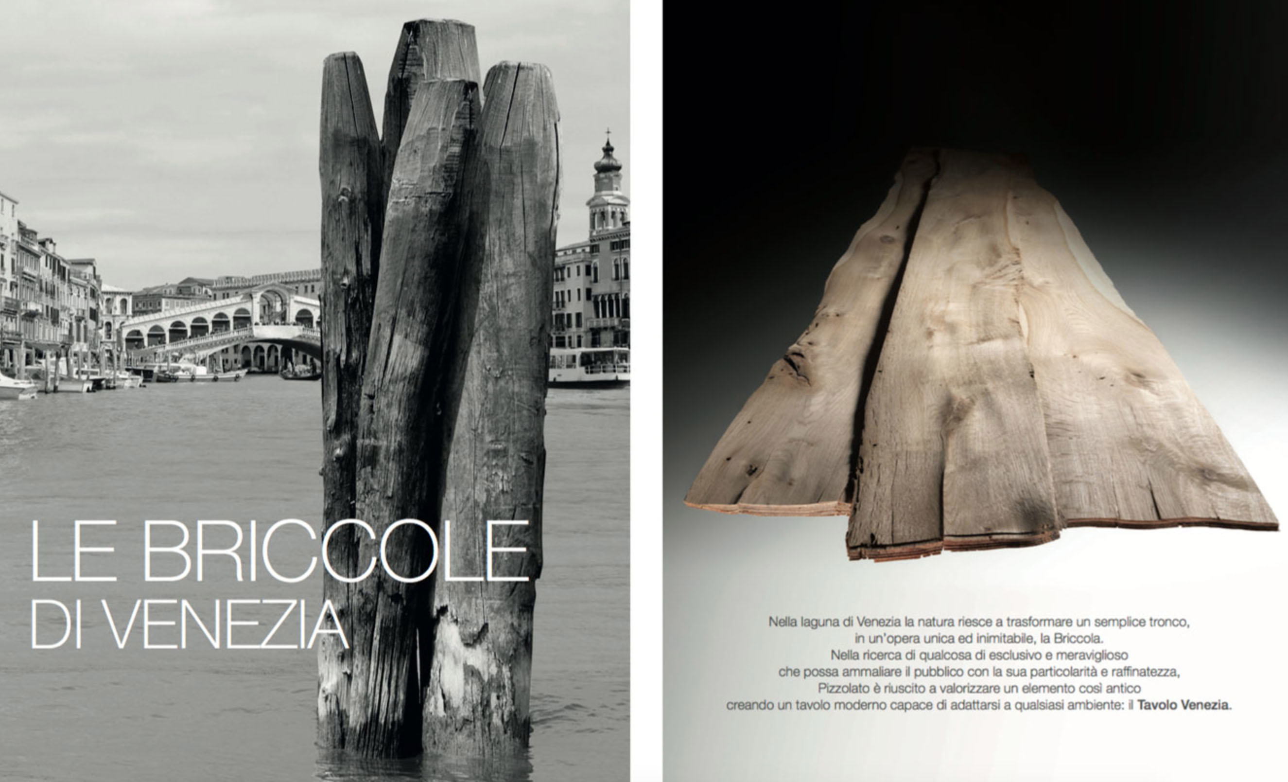 Tavolo impiallacciato su listellare con legno ricavato dalle briccole veneziane.