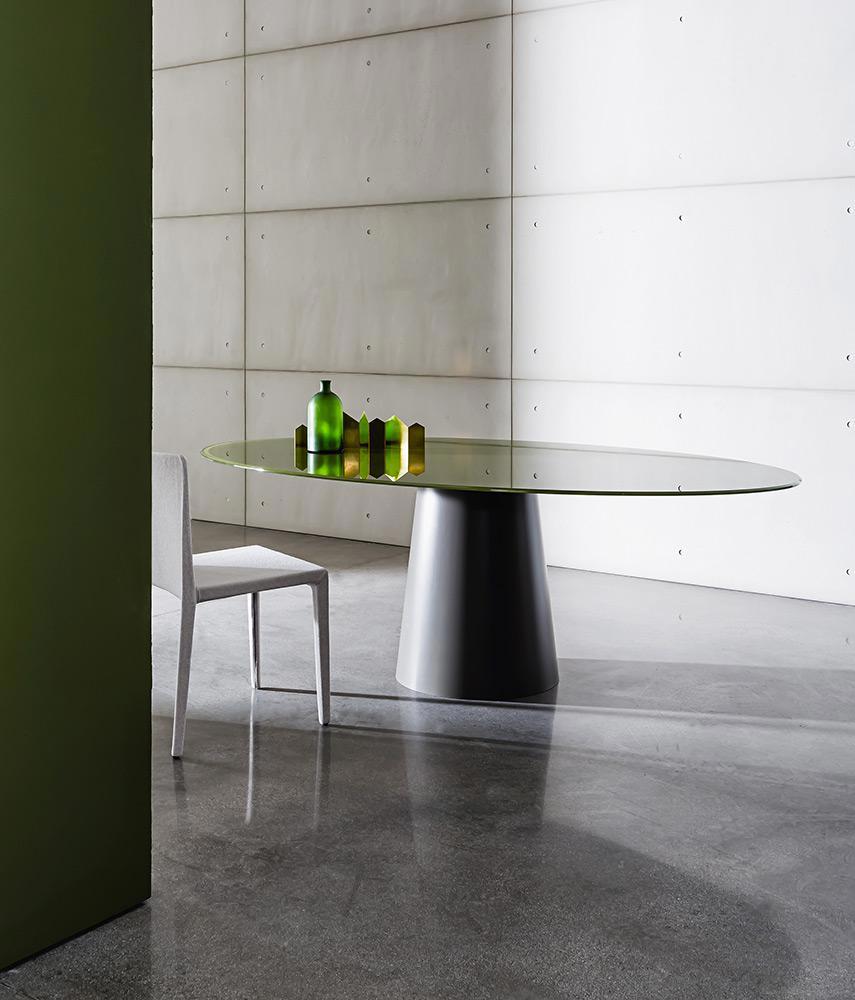 Si distingue soprattutto per la base centrale, solida e scultorea, che richiama appunto l’idea di un “totem”: un elemento verticale importante che sostiene il piano e diventa il vero protagonista estetico del tavolo. Questa soluzione non è solo decorativa, ma anche funzionale, perché elimina le gambe agli angoli e garantisce maggiore libertà di movimento attorno al tavolo.